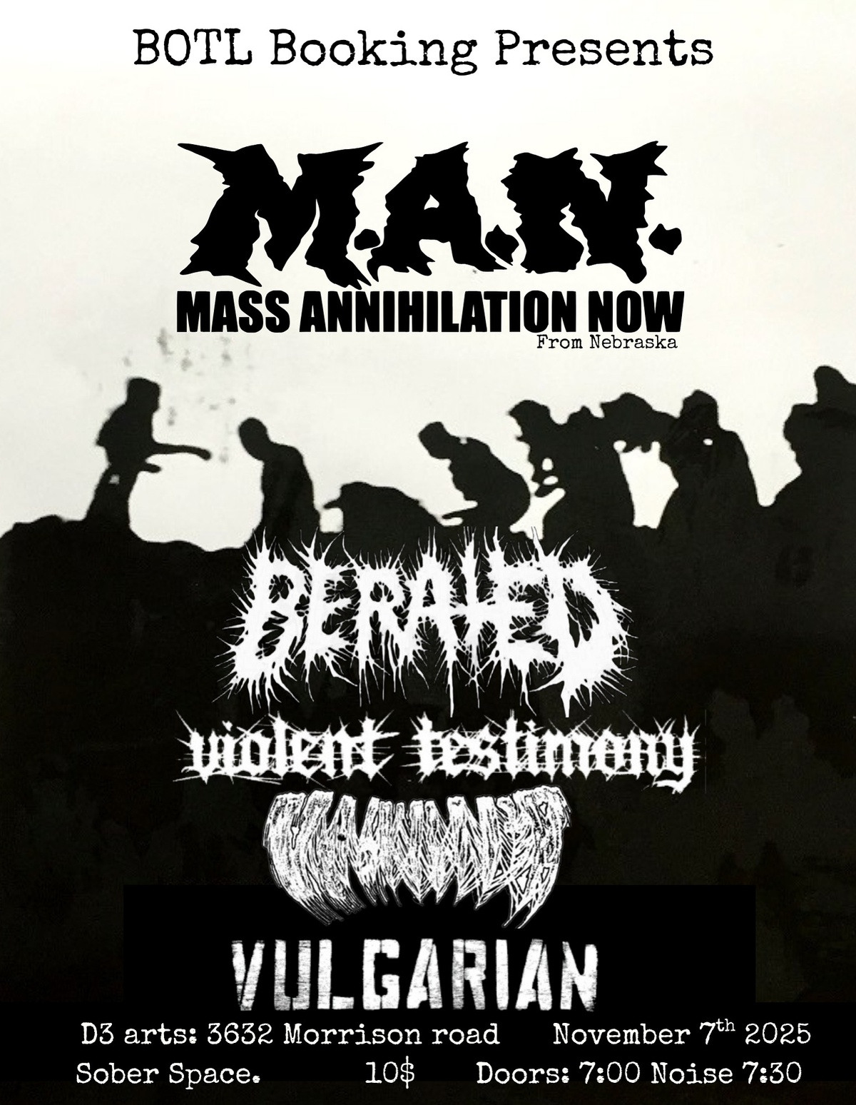 botl Booking presents, MAN from the heartlands of nebraska, a raw aggressive grind band. Local support includes Berated, Vitrify, Vulgarian, and Violent Testemony coming out with a new album.