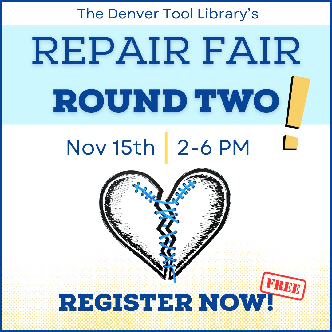 The Denver Tool Library is having our second ever Repair Fair on Saturday, November 15th from 2p-6p! This free community event is open to anyone who wants to attend or volunteer, we just ask that you please read our FAQ & register before you come. Please also spread the word with other groups, neighborhoods, and organizations you're a part of, we have big plans to make these a more regular thing if there is a community need for it!